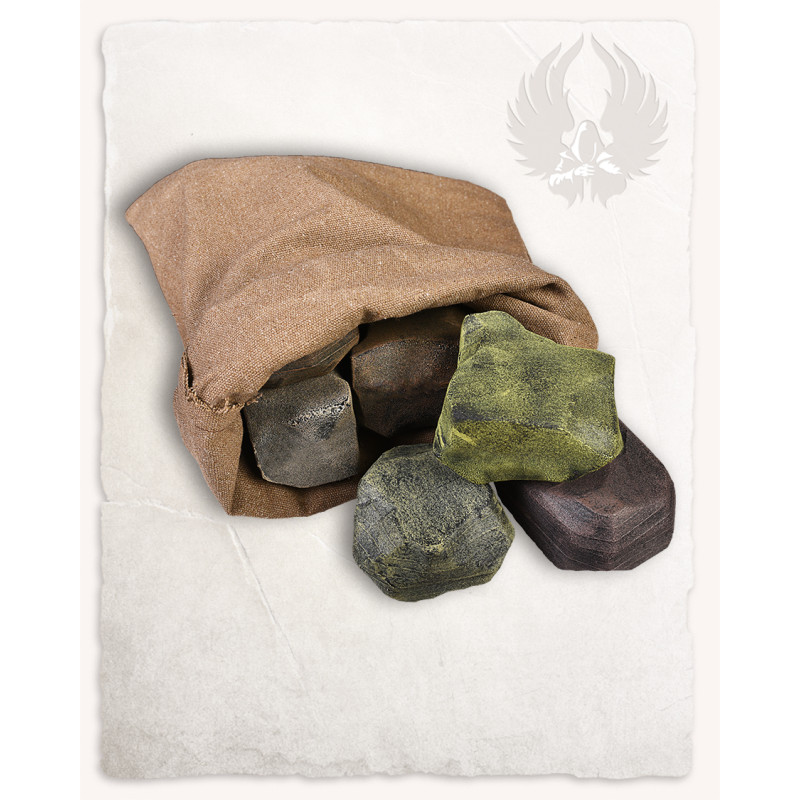 Zestaw zawiera dziewięć kamieni do rzucania z naszej nowej linii produktów „Battle Standard” oraz praktyczną materiałową torbę do transportu. Piankowe „kamienie” są bez rdzenia i ręcznie wykonane, dzięki czemu żaden kamień nie jest taki sam jak inny. Mogą służyć jako dekoracja lub, w zależności od zasad danego wydarzenia, być używane jako broń do walki w zwarciu lub do rzucania.