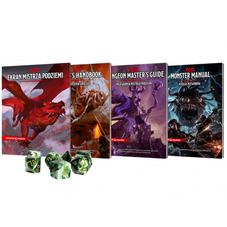 Zestaw trzech podstawowych podręczników do gry Dungeons & Dragons: Player's Handbook (Podręcznik gracza), Dungeon Master's Guide (Przewodnik Mistrza Podziemi), Monster Manual (Księga Potworów) oraz ekranu mistrza gry i zestawu 7 kości.