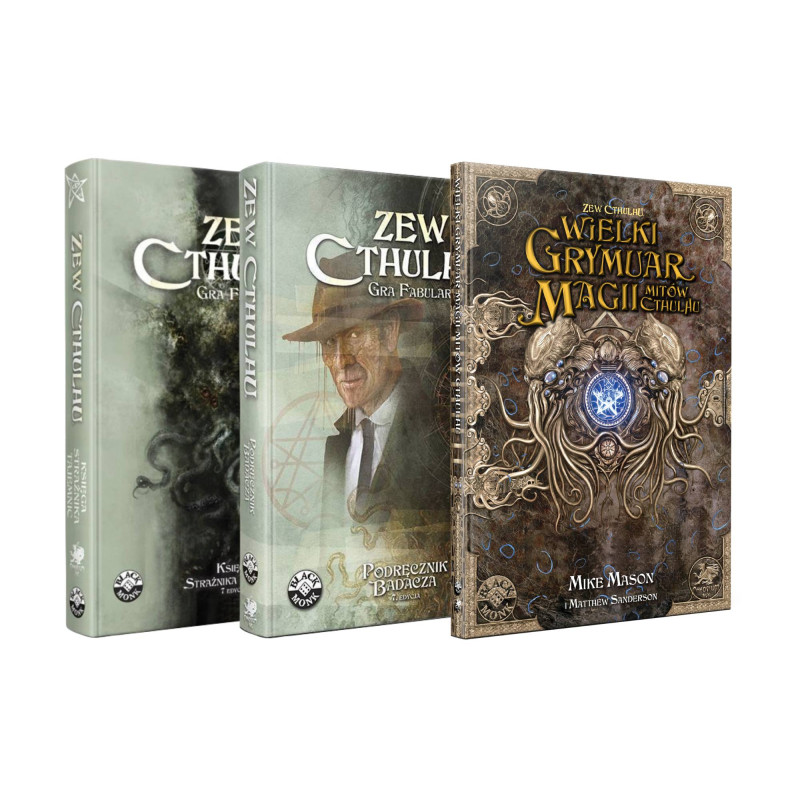 Zestaw trzech podręczników do gry Zew Cthulhu: Księga Strażnika, Podręcznik Badacza oraz Wielki Grymuar Magii.