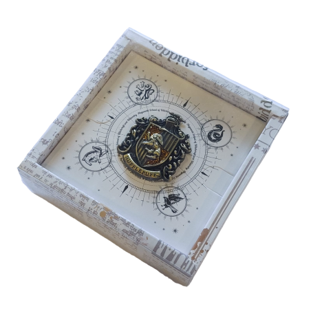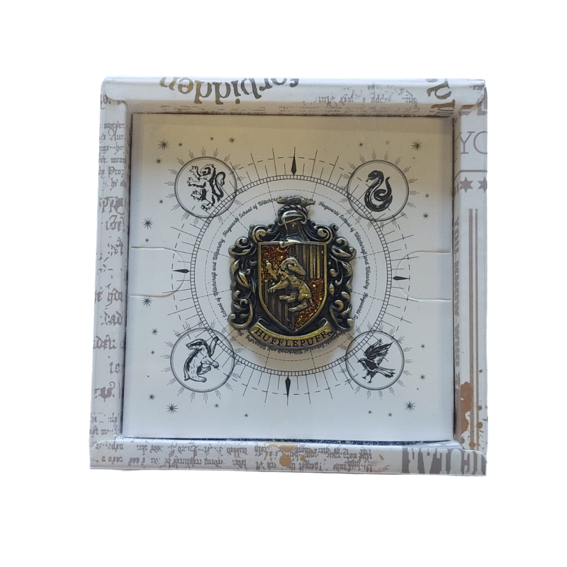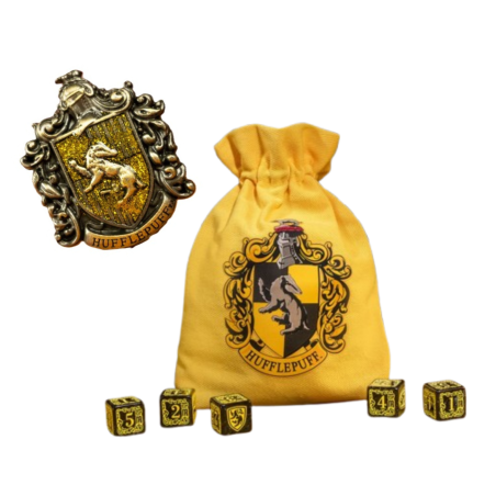 Zestaw Puchona promieniuje ciepłem i lojalnością. Sześć kości k6 w żółtych barwach oddaje ducha pracowitości, a starannie wykonany, przyjemny w dotyku mieszek kryje w sobie magię codziennych wyzwań. Dopełnia go metalowa przypinka z herbem borsuka – symbol domu, który pielęgnuje dobroć i przyjaźń.