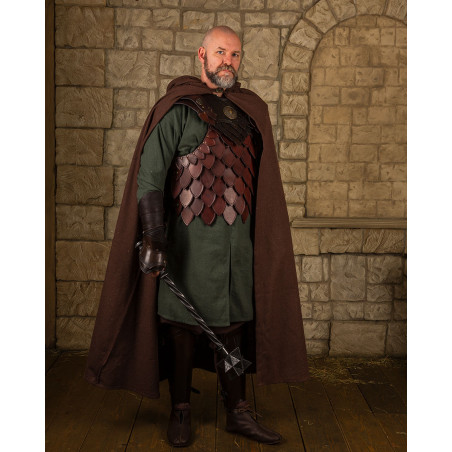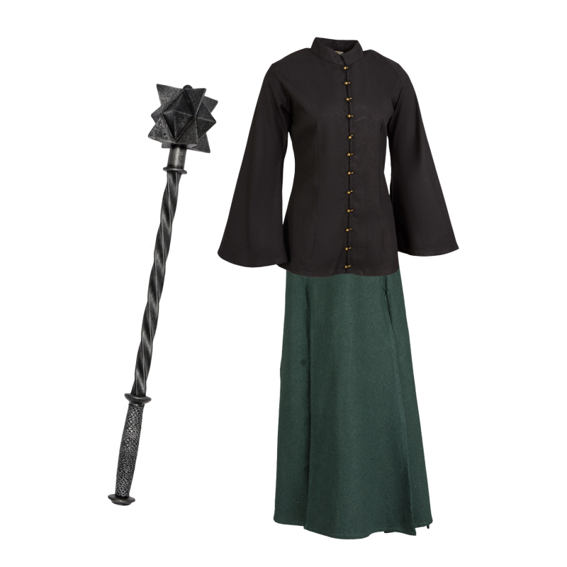 Zestaw startowy do larpu dla kobiety L to komplet zawierający piankowy buzdygan, czarną koszulę z ozdobnymi guzikami i rozszerzanymi rękawami oraz zieloną suknię. To idealny zestaw dla bohaterek, które chcą połączyć elegancję z siłą. Piankowa broń zapewnia bezpieczną i efektowną walkę, a strój daje swobodę ruchu oraz klimatyczny wygląd podczas larpów i gier terenowych. Komplet świetnie sprawdzi się również na konwentach fantasy, w cosplayu czy sesjach zdjęciowych. Dzięki gotowemu zestawowi od razu wcielisz się w postać wojowniczki lub przywódczyni.