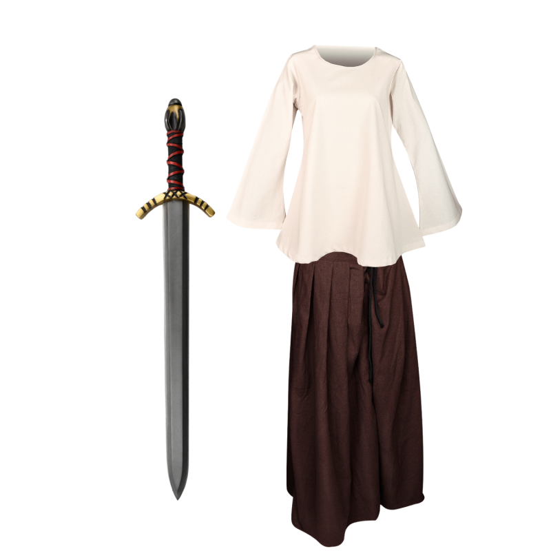 Zestaw startowy do larpu dla kobiety w rozmiarze M to praktyczny komplet, który przygotuje Cię na pierwsze wyprawy do świata gier terenowych i cosplayu. Składa się z klasycznej białej koszuli, wygodnej brązowej spódnicy oraz piankowego miecza z pozłacaną gardą i dopracowaną głownią. To zestaw idealny, aby rozpocząć swoją przygodę z larpem – pozwala wcielić się w postać rycerki, podróżniczki, najemniczki czy bohaterki rodem z powieści fantasy. Piankowa broń jest bezpieczna i nadaje się do potyczek w sesjach na żywo. To komplet, który sprawdzi się na larpach, konwentach fantasy, imprezach tematycznych oraz w cosplayu.